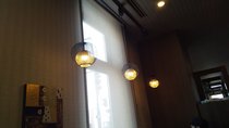 で、窓側の照明が代わりまして、明るく可愛いなりました。明るすぎるので朝食営業時は半分ロールカーテンを半分くらいおろしてます。