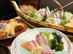 新鮮な活魚が人気の居酒屋さん。お昼はランチ営業されています。こちらに来たら新鮮なお魚を頂かないと、活魚お刺身定食は、鯛、ヒラメ、ブリ、鮭などアジは尻尾がピクピクと動いています。本日の新メニューは、チキン南蛮とヒラメフライ御膳でした。刺身、茶碗蒸し、小鉢、あら汁が付きます。お店の前に駐車場が何台分か有りますが、お店の奥にも共同の広い駐車場が有ります。
