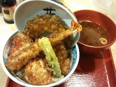 南森町駅近くの天神橋筋商店街内にあります。お昼時なので、店内は満席で少し待ちました。「金目鯛と春野菜天丼+瓶エビスビール」を注文。揚げたてで美味しかったです。