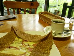 ソバ粉のガレットがメインで食事とデザートに分かれています。出されたガレットがちょっと大きくて、食べきれるか心配になりましたが、生地が薄いのでペロッといけました♪建物はログハウス調でとても素敵です。席からの景色が最高でした!!お土産処もあり、ゆっくり過ごせました。鏡池の目の前なので、散策前でも後でも気兼ねなく立ち寄れると思います。