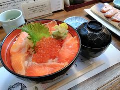 紅トロいくら丼と海鮮生ちらし丼と、炙りサーモンのお刺身を注文。サーモンは脂が乗っていて美味しかったです。