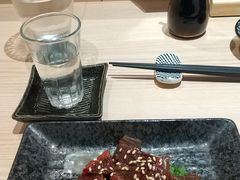 アテもつまみも種類豊富で、希少部位のまぐろ血合のユッケ風があったり(美味)、魚好きそうな店主さんでした。