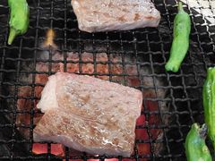 ステーキ店、すき焼き店、松坂牛目が飛び出〜る価格 150g20000円とかネットで検索すると出てくる。松坂インターを下りるとこの手のお店の看板がピカピカ眩しかった。150gでは絶対満足できないとさらに検索。焼肉で楽しめる松坂うし一升びん、これならと松阪城攻略後直行。少々待ちましたがその間焼肉の匂いでますます腹ペコ状態。セット焼肉+ご飯+サラダを頼むことに、で、セットは.....後悔したく無いので特選ロースのあるA-5セットを注文。しかし150g20000円が頭から離れない6000円でどんだけ〜っと口の中でとろける特選A5ロースをじっくり味わいながら考えてしまう。ホルモン盛り合わせがでてきてこれで終わりかと...その後もう一皿でてきたので大満足でした。