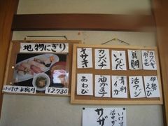 まぐろ、玉子、あなご、その日に捕れた地魚など8〜9種類の具が入っている『大名チラシ』は、ごはんと具が別々に分かれて2段のお重で出てくる豪華版。地元の人も何かと利用するお馴染みの食べ物だそうだ。地魚はその日に捕れたイキのいいものばかりでおすすめ。地魚中心の地物にぎりは3150円だ。