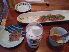 石垣島のお店は基本的に予約なしでは無理なそうで、ここも知人が予約してくれました。前に予約しようとしたらいっぱいで、来れなかったことがあるそうです。タクシーの運転手さんも行き先を告げると、「予約してますか?」と。以前、予約なしのお客さんをのせたら、8軒連続で断られたことがあるそうです。こじんまりした落ち着けるお店て、泡盛の牛乳割、カルパッチョ、天麩羅、小鍋を注文。どれもとても美味しかったです。