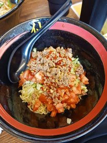 冷やし台湾ラーメンを頂きました。確かにミンチは辛いのですが、トマトときゅうりでさっぱりいただけるので、辛いのが苦手な方でも食べられるんじゃないかな、と思いました。