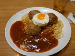 様々なバリエーションのスパゲッティがメニューに並んでおり、中でもミーとスパゲッティがとても人気の一品となっています。