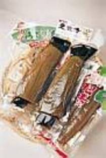 | 説明 | 佐原産をはじめとした漬物を約200種類揃えている。人気商品は、佐原で育った伊能忠敬の名を冠した『忠敬漬』。唐辛子を日高産の昆布で何層にも巻き、さらに厳選された瓜で包み、しょうゆで漬けたもの。昆布が隙間なく丁寧に巻かれた切り口が見事だ。瓜のかわりにキュウリを使ったものもあるので試したい。 昆布の旨味が瓜に染みた佐原名物の『忠敬漬』 |