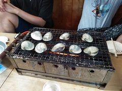 海鮮物が食べれるので、海のほうへ来たときは、こういったもの食べたいですよね。炭火で焼く蛤は格別おいしくてビールにあいます。