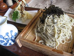 丈屋造りの大農家を移築したとあって店内には、いろり、わらぐつなどの民具が展示されており、昔懐かしい気分にさせられる。何といってもこのお店のお勧めは『合盛天ざる』。つなぎに山芋と粉末にしたそばの若葉を加えたコシの強いそばと、のどごしのいい自家製うどんを一度に両方味わうことができる。