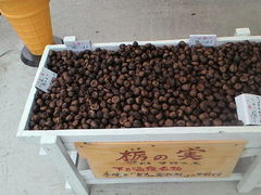 栃の実が店の前にあり実際に触ってみましたが栗の様ですがそれより堅くて重い感じでした。
