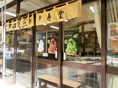 創業当初から全て手焼きで作られてきたという『とちの実煎餅』を中心に、飛騨の土産物を販売する。小麦粉とざらめ、卵をまぜあわせたものを一枚一枚丁寧に焼き上げる。ここでは、そんな焼きたての『とちの実煎餅』を、セルフサービスで入れる香ばしい『しいたけ茶』と一緒に、無料で試食することもできる。