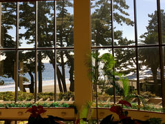 目の前に今井浜海岸があり、松の木と椰子の木の和洋折衷な風景が面白いです。