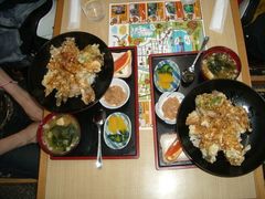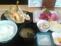 おいしいかつたんですが、惜しむらくは最近の強風で深海魚が上がらず、深海魚の刺身が食べられなかつた事です。このクチコミでも最高の評価をしている超なじみ店を素通りしてわざわざ言ってこころぐるしい思いをしているのでちょっとガッカリです。まぐろの刺身、深海魚の天ぷら、海鮮グラタンがせっとになつた定食をいただきました。やはり超なじみの店は裏切れないので、この店も味は合格なんですが、残念ながらリピートはかなり難しいです。