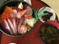 (人気の海鮮丼は高いので)マグロの中落ち丼を注文しましたが、値段は許容範囲(千円ちょっと)で、特にマグロが少ないこともなく、漁港近くで即売所併設だけあって、それなりに新鮮で美味しかったです。