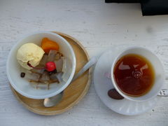 国道沿いにありますが、非常に分かりずらい場所です。2階にある小さなカフェです。自分はクリームあんみつと紅茶のセットを頼みました。おいしく、価格も良心的です。外のテラス席からは海と周りの畑が見えます。時間が止まっている雰囲気です。双眼鏡が置いてあり、遠くの海の様子も見ることができました。お店の方は非常にやさしい方でした。