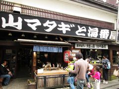昼から開いている飲める食堂と立ち食いができるお店です。湯畑からの散策途中に食べ歩きできる地産の串焼きと焼きおにぎりがおススメ。