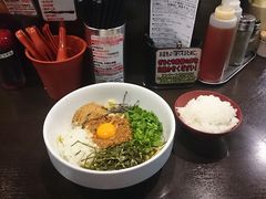 台湾まぜそば専門店。名古屋が発祥とされる一種の汁無し麺で、魚粉系の具材を加え、よく混ぜて食す。その味わいは従来にないユニークなもの。スタンプカードのハンコが2つ貯まるとトッピング無料のサービスもハードルが低くてうれしい。