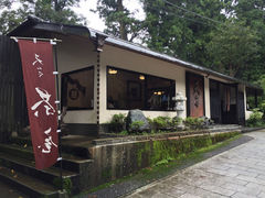 大雄山最乗寺方面から大雄山駅へ「てんぐのこみち」や「大雄山あじさい参道」を歩き、小雨の中傘をさし荷物も重く疲れを感じてきた頃、仁王門のすぐ横にあるこちらを見つけ立ち寄りました。お土産に手頃な価格の「天狗伝」というサブレを職場の人数分+2個買いました。11:00頃でお食事も始まっているようでしたが、まだそれほどお腹も空いていないので「道了餅」を二つ買って歩きながら食べました。「すっごい美味しい!!」柔らかいお餅と程よい甘さのあんこが疲れた私たちを癒し、夫と顔を見合わせながら笑顔になりました。帰宅してから「天狗伝」も食べましたが、厚みがあってザックリホロっとした食感が美味しかったです。お店の中も素敵でしたし、食事もとても人気があるようなので、大雄山に行った際にはまた立ち寄りたいと思いました。