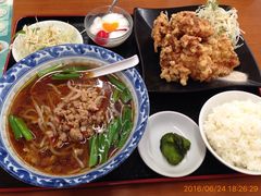 大きなから揚げに台湾ラーメン、野菜にごはん、杏仁豆腐までついてました。