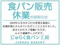 じゅらく食パン工房より:食パン販売休業のお知らせ