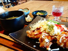 箕面の観光マップに載っていた、ゆず黒酢あんのふわふわチキン南蛮を注文しました。