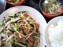 にらホルモン炒め定食、もやしたっぷり、やわらかホルモンで醤油風味、ごはんが進む。チンジャオはホルモン炒めよりも濃い目の味付けながらこちらもごはんとの相性ばっちり。サラダ、スープ、ナムル付き、ボリュウムある定食、本日は特に盛りが良かったような気がする。