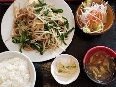にらホルモン炒め定食680円、たっぷりのモヤシにニラ、柔らかホルモンの熱々に炒め、甘辛醤油の控え目な味付けはご飯が進む。スープ、ザーサイ、サラダの小鉢つき、ボリュームもあり、CP良し。昼時は混み合います。