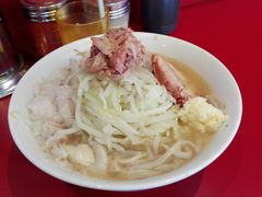 駅から徒歩5分ほど歩いた場所にある二郎直系の店舗です。二郎の中でも麺はパスタのようににゅるっとしていて、豚はでかい、あっさりめ、量がかなり多いです。給水器周辺に味変用のアイテムが置いてあります。