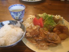 「九重夢ポークのしょうが焼とコロッケ定食」。