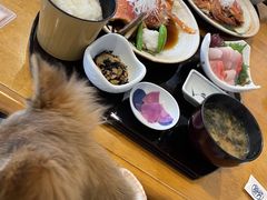わんこメニューもあったのですが、あまりにもチビなので、頼めなかったので、ヤギプリンみたいなのがあればと思いつつ、私達は、金目の煮付けとお刺身定食にしました。とろみのある甘めの煮付けが好きなので、私にはあっさりでした。お刺身は、美味しかったです。
