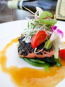 投稿時期:2025年10月23日本日ご紹介するおは、ホテル最上階、Sky Restaurant Hareusでご提供している「季節のディナーコース Saison」でお楽しみいただける秋のご馳走。こちらのコースの魚料理では、黒胡麻をまぶして香ばしく焼き上げた秋鮭のポワレをご堪能いただけます。かつおの出汁が効いた土佐酢にコク深いバターを合わせた、和と洋が織りなす特製ソースが、鮭の旨味を優しく包み込みます。