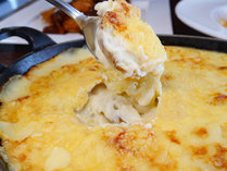 鱈とほくほくのじゃがいもを重ね、濃厚な生クリームとバターで仕上げたクリーミーなグラタン。鱈の上品な旨味とじゃがいものやさしい甘みが溶け合い、香ばしく焼き上げたチーズの風味が豊かな余韻を添えます。オーブンで丁寧に焼き上げた、冬にぴったりの一品です。