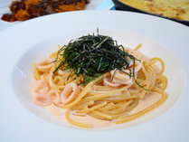 プチプチとした明太子の食感と、やわらかく仕上げたイカを濃厚な生クリームソースで合わせた一皿。明太子のほどよい塩味と旨味がイカの甘みと調和し、まろやかなソースがパスタ全体を包み込みます。素材の持ち味をいかした、シェフおすすめのクリームパスタです。