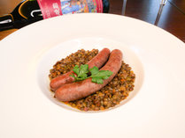 写真は、Sky Restaurant Hareusでご提供中の「エゾシカソーセージとレンズ豆のオーベルニュ風」。
