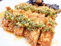 本日ご紹介するのは9月のシェフおすすめメニュー「揚げ鶏と茄子の香味ソース」です。
