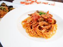 旬の茸にツナと完熟トマトを合わせ、香り立つガーリックオイルで仕上げたスパゲッティーニ。