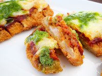 サクサクの衣に包まれた豚ロースのカツに、イタリア・ナポリ生まれの“ピッツァイオーラソース”をたっぷりと。完熟トマトにオレガノ、バジル、ガーリックを効かせた香り豊かなソースが、ジューシーな豚肉の甘みと絶妙にマッチします。仕上げにチーズをのせてとろりと溶かし、食べごたえも満点。ハーブの香りとトマトの酸味が広がる、食欲そそる一皿です。