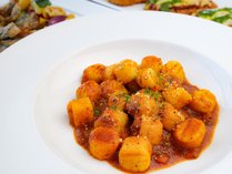 もちもち食感のじゃがいもニョッキに、牛と豚の合挽き肉を香味野菜とともにじっくり炒め、完熟トマトと赤ワインで煮込んだコク深いミートソースをたっぷり絡めた、秋らしい一品。コク深いチーズの風味が味わいのアクセントとなっています。