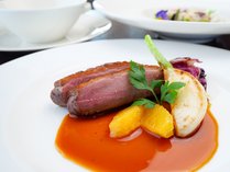 メインディッシュには、滝川産の鴨肉をじっくりとローストし、ジューシーでしっとりとした食感の一皿を。オレンジの爽やかな酸味とほどよい苦みがアクセントのビガラードソースが、鴨肉の旨味を引き立てます。