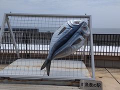 2階べランダにはフォトスポットのアジの干物のオブジェがあります。天気が良ければ自分も干物になって張り付きたい!ほどの大きさです。