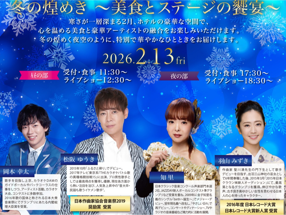 - 〜【S席確約!】紫雲閣ディナーショー開演!「豪華4名アーティスト出演のライブ」とシェフの織りなす美味しい料理をお楽しみください〜