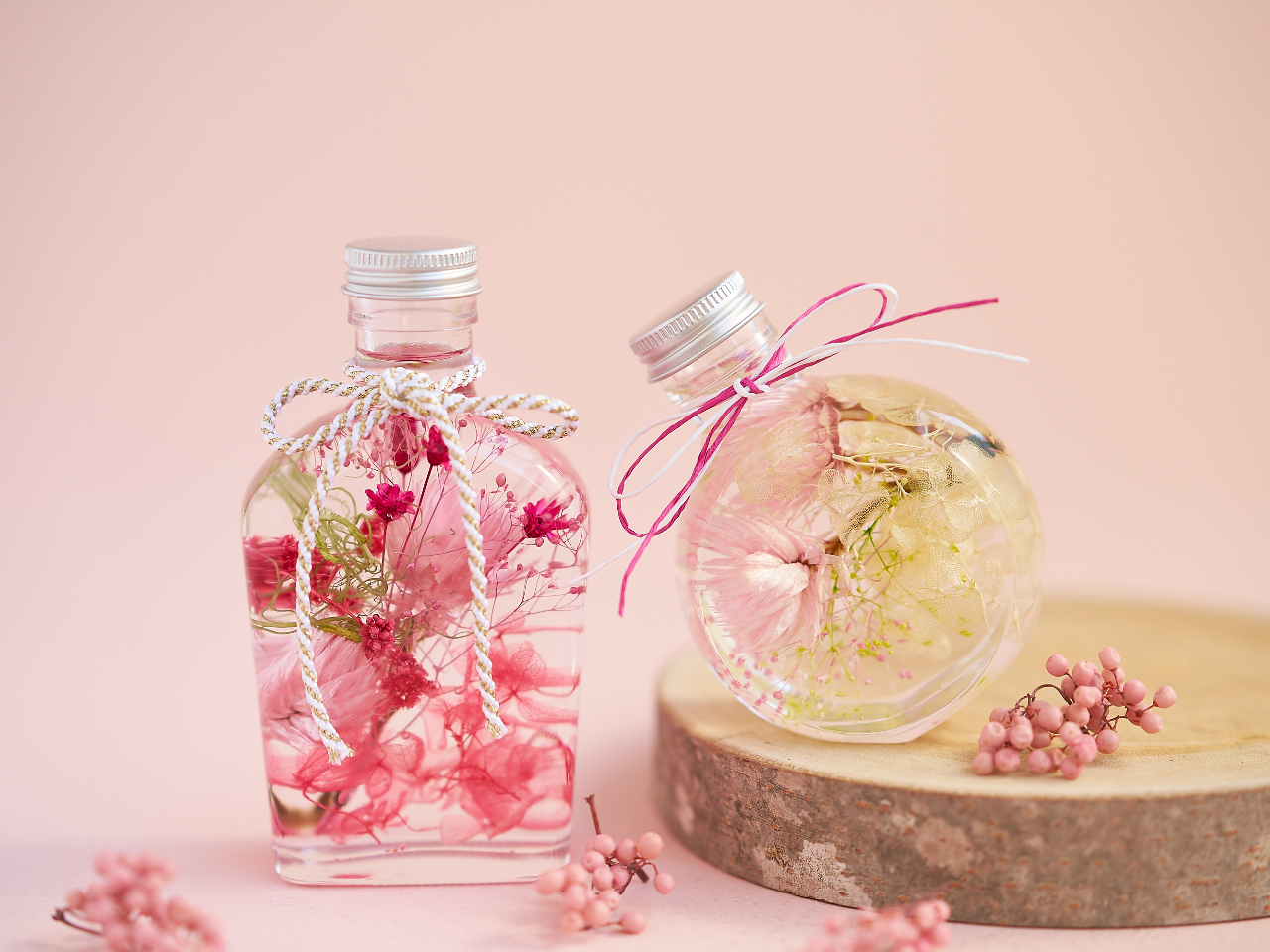 - 春色のお花をガラスボトルに閉じ込める、きらめくハーバリウム体験