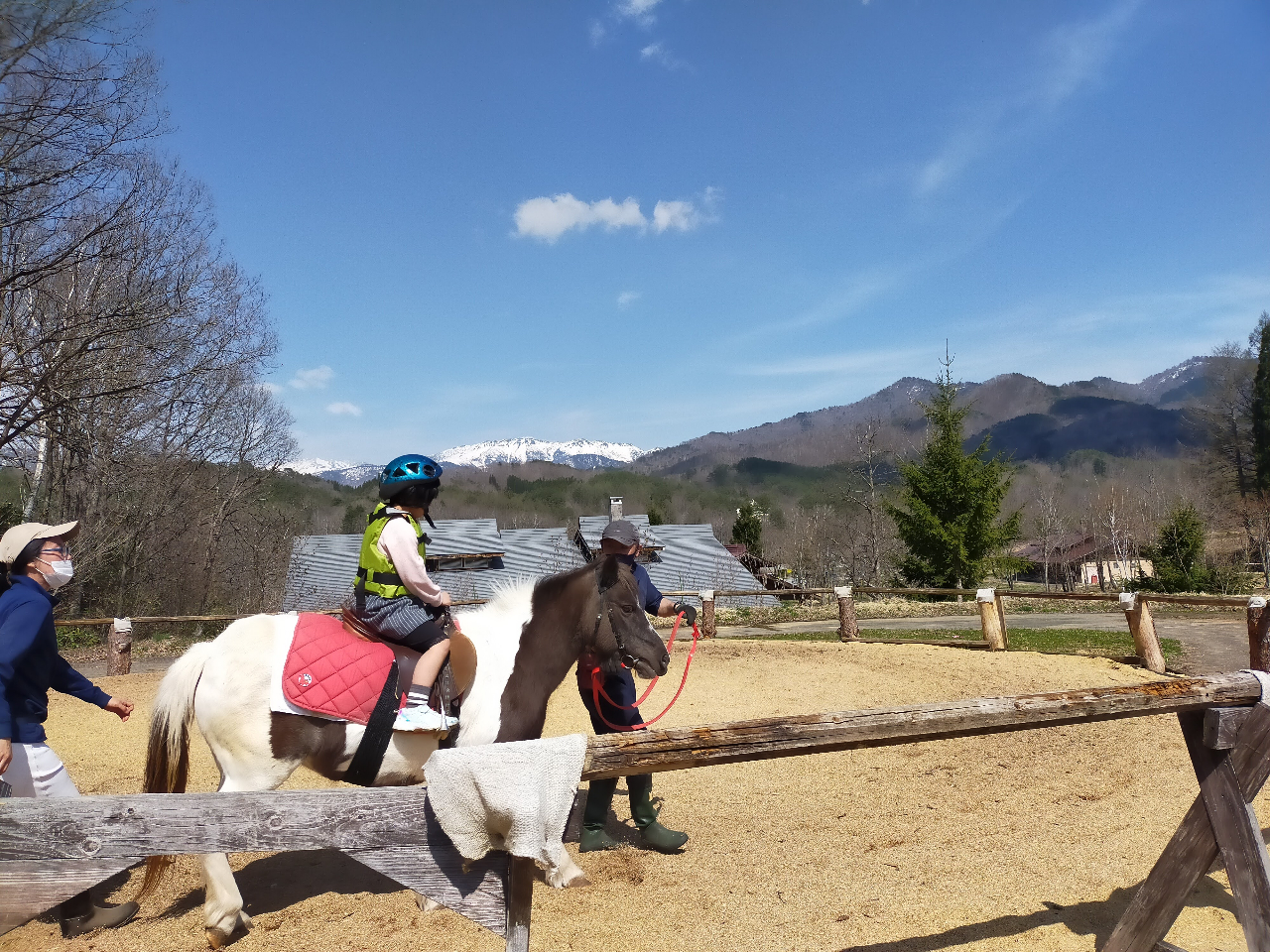 - 北アルプスの山々を背景に心地いい風を感じながらプチ乗馬体験♪スタッフが綱を引くポニーに乗るので初めての方でも楽しめます。馬にひとりで座れるお子さまから体重50キロの方まで体験できます。