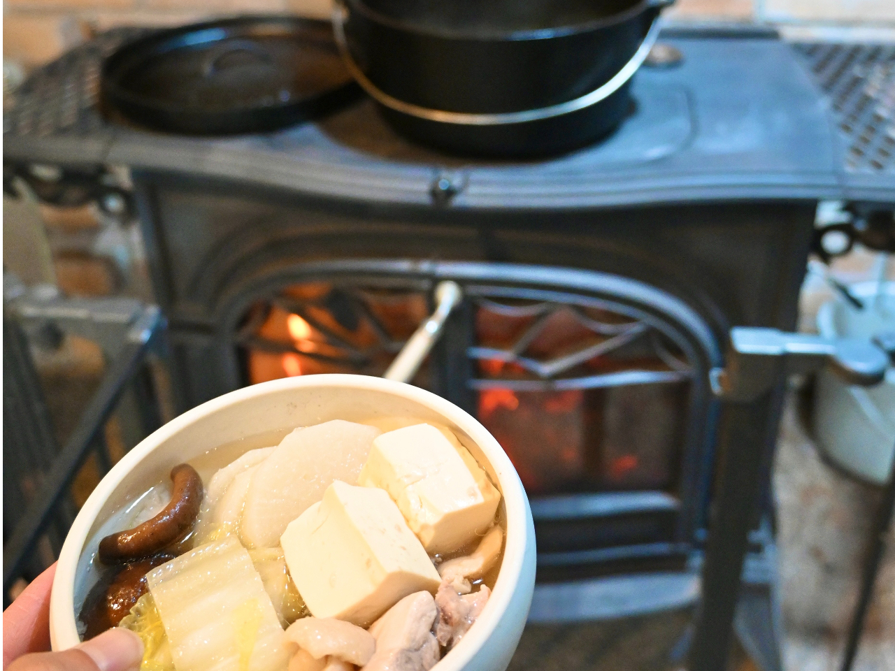 - ●奈良の自然豊かな大和高原で手ぶら鍋♪ ●薪ストーブとダッチオーブンを使って鍋ができます! ●屋根付きテラスで雨の日でもOK ●外と繋がる薪ストーブルームで、冬のワンデイキャンプ気分♪
