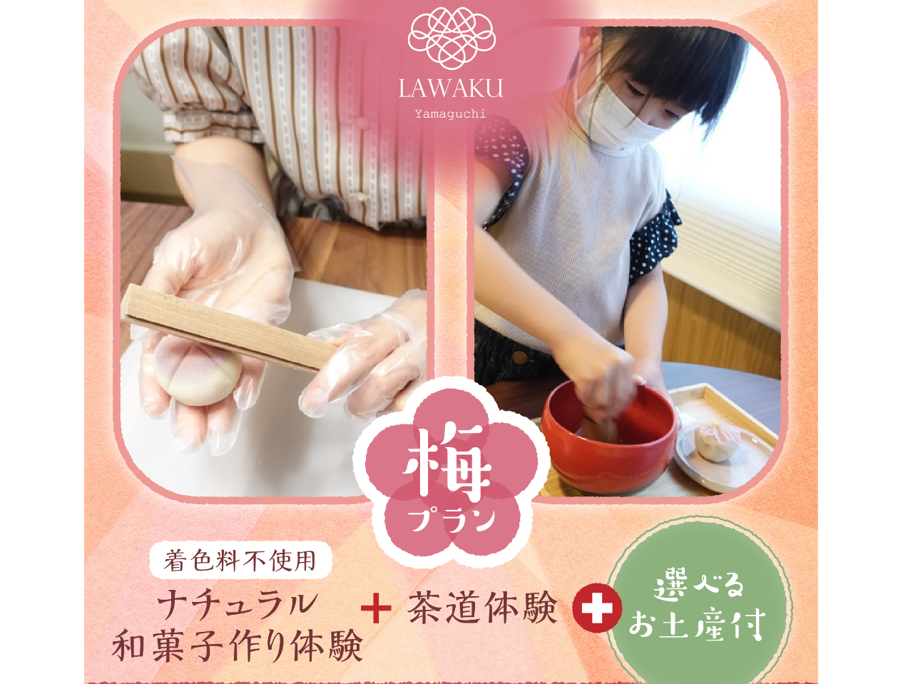 - 【梅コース】 ●ナチュラル和菓子作り体験(1個) 可愛らしい色と形が魅力の「ねりきり」をつくります! ●お抹茶体験 抹茶の味わいや所作にお手軽に触れられます! ●選べるお土産付き