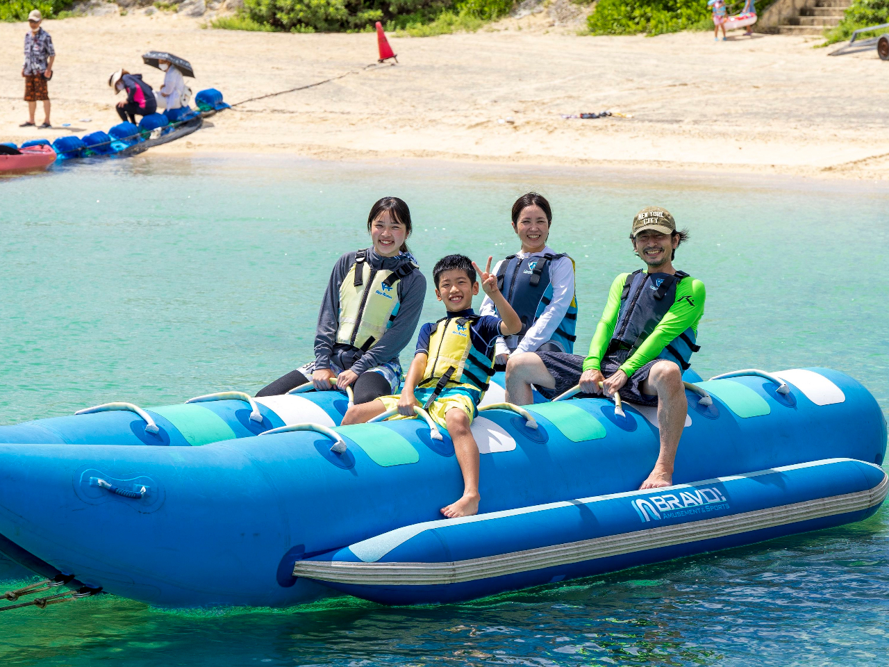 【沖縄本島・北部・瀬底島】【GoPro撮影!写真動画無料プレゼント!】【ニモやウミガメ、たくさんの魚がゼロ距離!】当店自慢!!不動の1番メニュー!バナナボートで行くシュノーケリングツアー♪