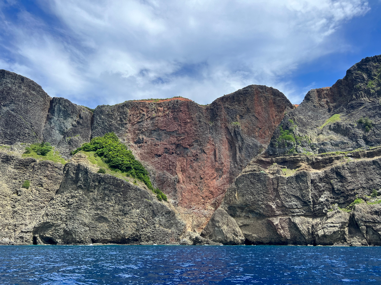- 沢づたいを歩き、旧軍道を抜けて開けたハートロック上の景色は最高!! 250mの断崖!まぶしい青空に映える赤土!海を渡る雲の影!水平線には母島が望める事も!