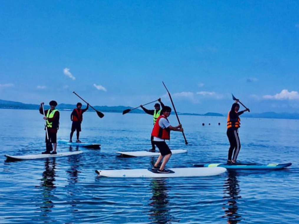- はじめてのSUP体験でも安心の穏やかな海上です。 しっかりフォロー&道具一式も準備しておりますので初心者でも大丈夫! お昼ごはんもついているので1日を通してSUP満喫したい方へおススメ!