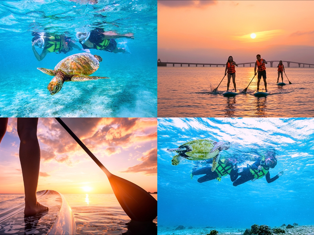 \宮古島の定番/ウミガメシュノーケル&サンセットSUPツアー|再チャレンジ無料保証|GoPro写真&動画無料|温水シャワー、ドライヤー完備|ファミリー・カップルおすすめ!